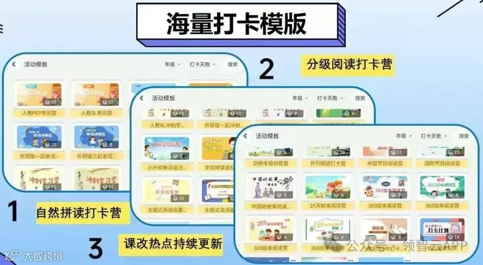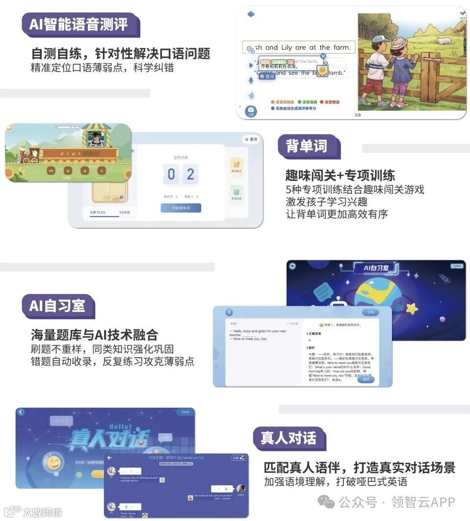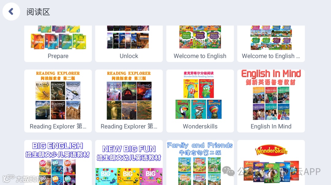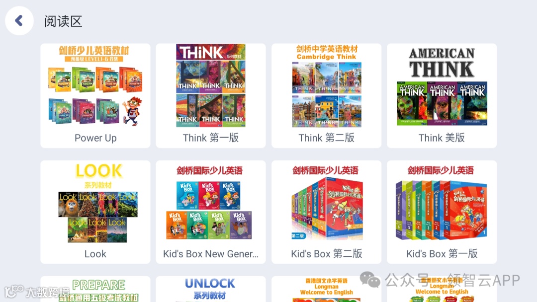 提供市面上几乎所有的英语教材资源,Power Up、Raz、剑桥、国家地理、大猫等,校内各版本教材,原版教材+绘本+配套习题,老师还可以上传自制教材(三级等保,只会出现在自己的APP里,不会外传的)