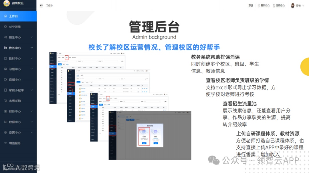 为助力机构同步达成降本、提质与增收,增加家校沟通,我们领智云(领视云)专为教培机构提供定制化解决方案,深度融合“SaaS+AI”技术,实现全链路赋能,融合了腾讯混元、阿里通义千问、DeepSeek等大模型。