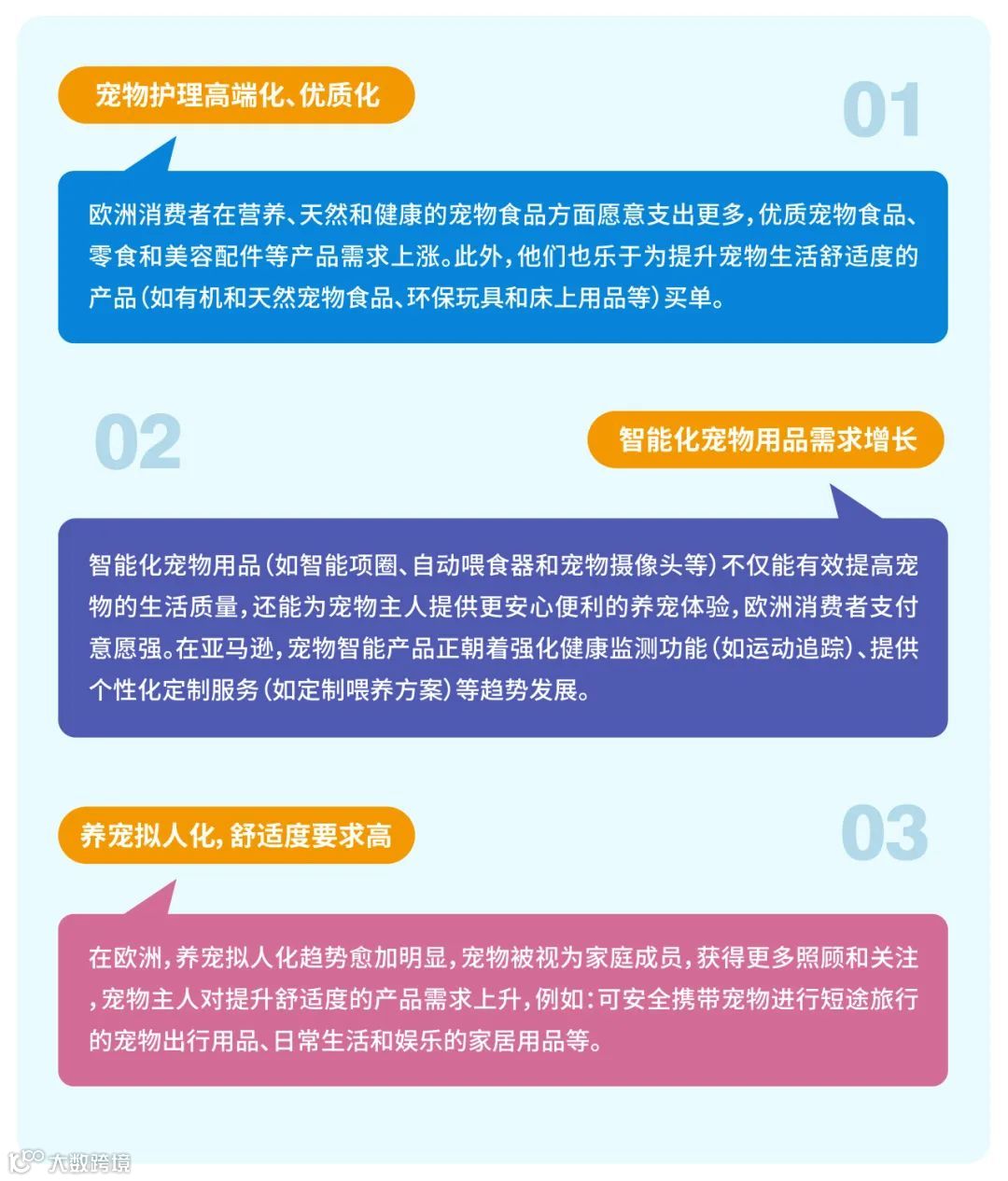 随着宠物在家庭中的地位不断提升,宠物主人对宠物饮食、健康、娱乐等方面的需求也日益多样化。从高端宠物食品到智能宠物用品,从宠物美容到宠物医疗,欧洲宠物市场的每一个细分赛道都充满了商机。