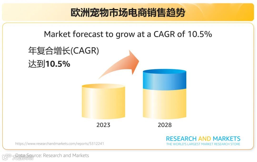 欧洲宠物各零售渠道中,电商持续领跑行业增长,年复合增长率10.5%,至2028年超30%消费者会通过线上方式购买宠物用品和食品。
