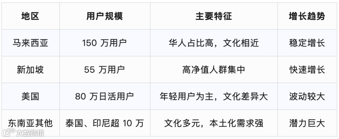 海外用户群体的快速增长为小红书带来了国际化发展的新机遇。目前海外用户主要集中在亚洲地区(马来西亚、新加坡、中国香港、中国台湾)和美国,呈现出多元化的特征。