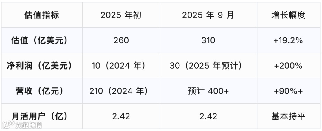 小红书在资本市场的表现堪称2025 年最亮眼的独角兽之一。估值从年初的 260 亿美元飙升至 310 亿美元,涨幅近 20%,这种增长速度在当前的市场环境下极为罕见。