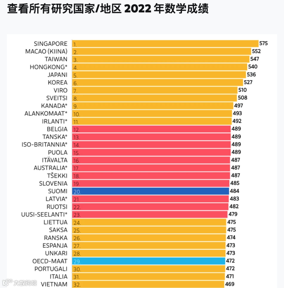 在数学方面,新加坡以575分表现最好,其次是其他一些东亚国家和地区。