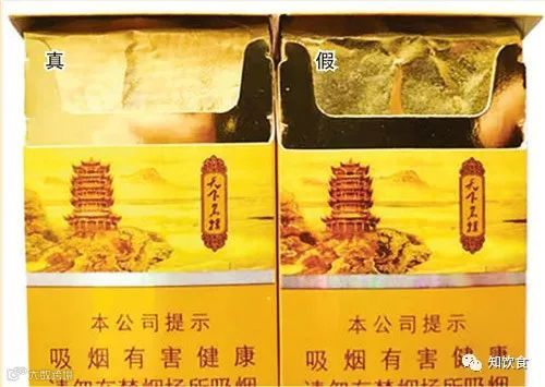 衬纸差异对比:真烟衬纸底部呈网格状,“黄鹤楼”字体、拼音清晰;假烟衬纸底部平整,“黄鹤楼”字体、拼音模糊不清。
