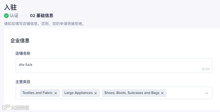 设置店铺名称并选择主营类目(需用英文填写,且全网唯一)