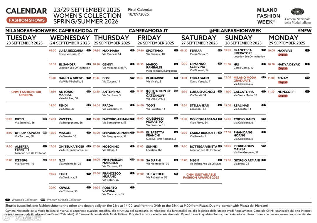 时装周期间,经意大利国家时装商会(CNMI)筛选并认证的买家与记者,可乘坐穿梭巴士往返于各时装周活动场地。