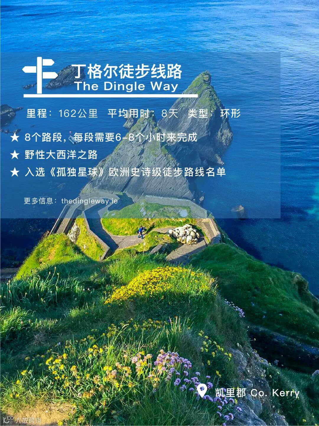 丁格尔徒步线路是今天三叶草君着重介绍的徒步路线,它位于凯里郡,是一条围绕丁格尔半岛的162公里长的环线。该徒步线路还入选《孤独星球》欧洲史诗级徒步路线名单,加上北爱尔兰堤岸徒步线路,爱尔兰岛共有7条路线入选。