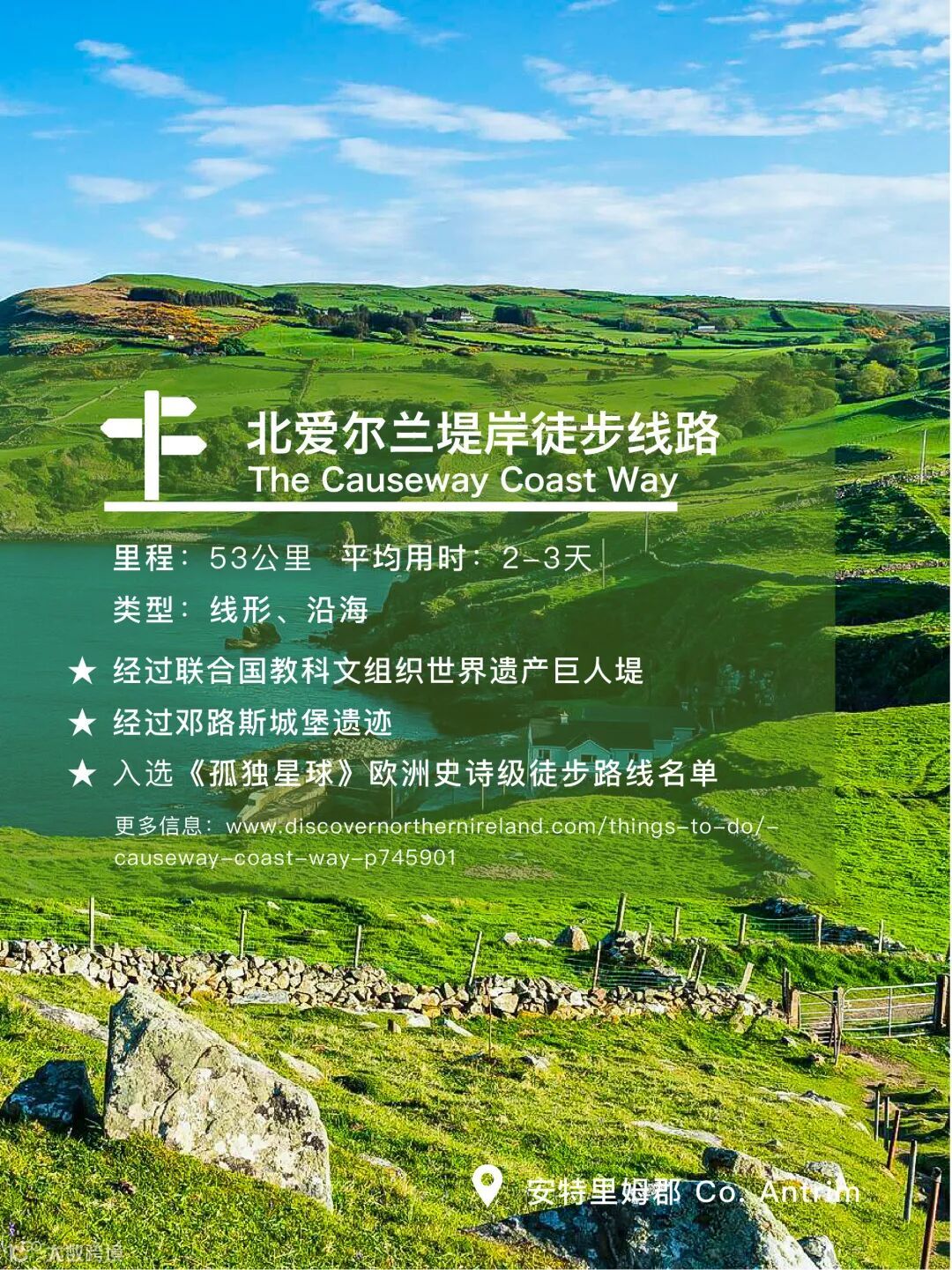 这条徒步线路连接了滨海小镇巴利卡斯尔 (Ballycastle)和波特斯图尔特 (Portstewart),途中还会经过巨人堤 (Giants Causeway)、卡里克索桥 (Carrick-A-Rede Rope Bridge)、邓路斯城堡 (Dunluce Castle)等打卡胜地。霸榜排行榜的同时还能在朋友圈分享打卡美照,一举两得。