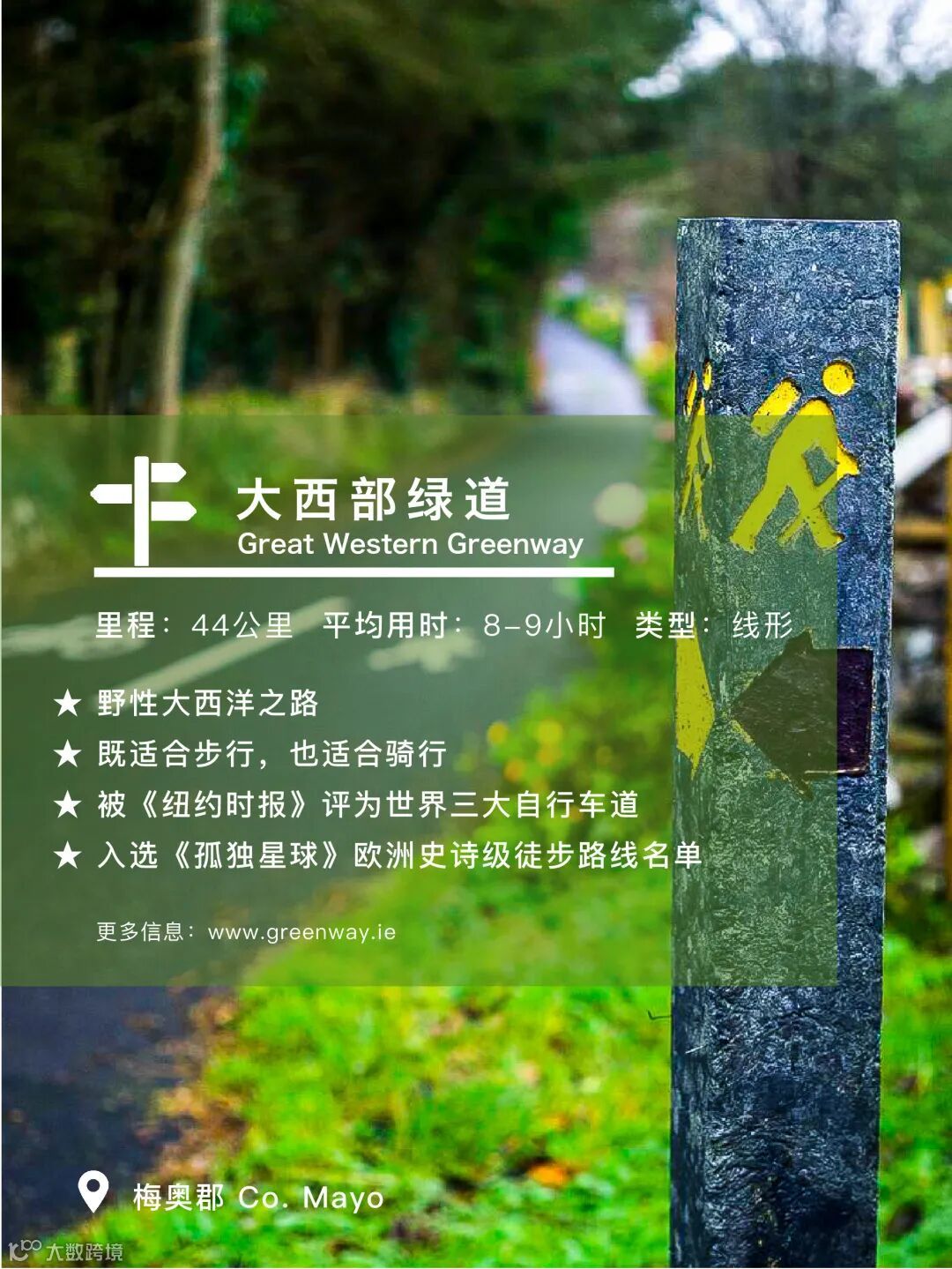 大西部绿道沿着克利夫湾 (Clew Bay)蜿蜒而行,全程44公里,步行用时8-9小时。这条线路既适合步行,也适合骑行,沿途梅奥的山脉、沼泽、农田以及大西洋海岸线等景色随时会给你惊喜。