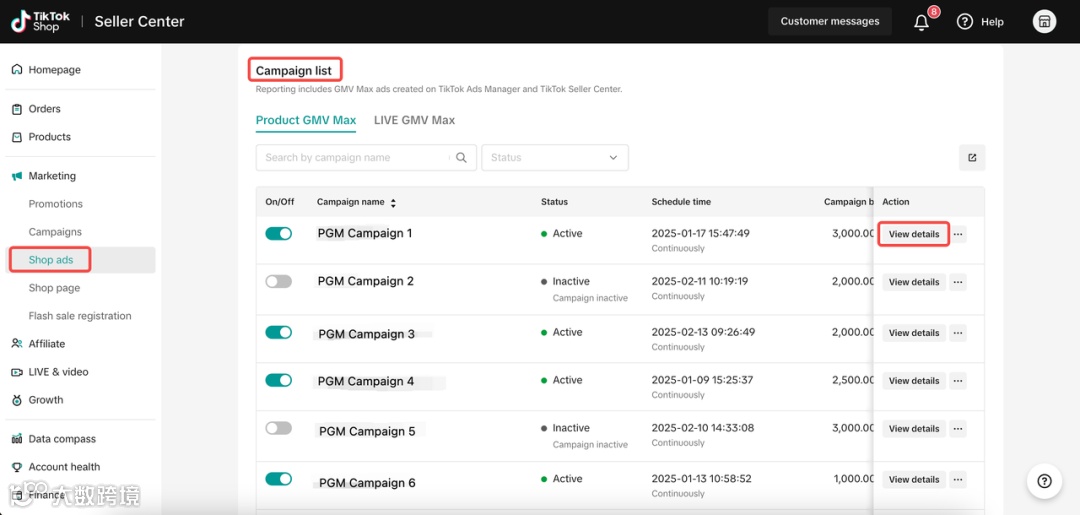 - 进入GMV Max campaign页面,复制URL中campaign id对应数字