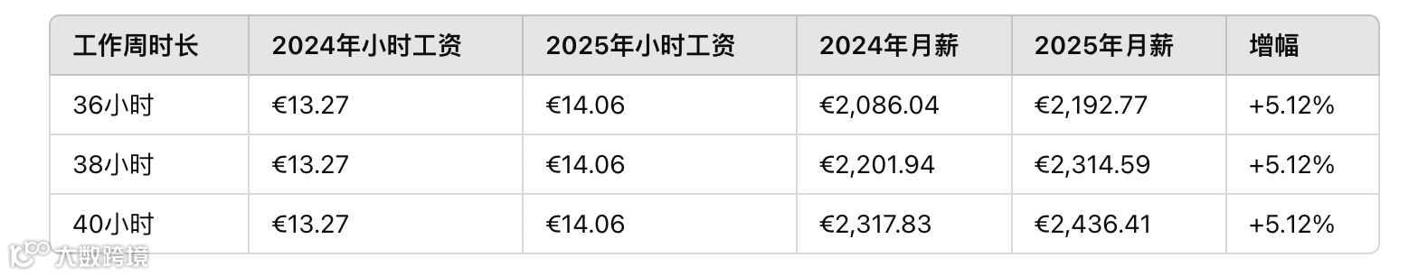 荷兰月薪通过将时薪乘以合同或集体协议(CAO,Collectieve Arbeidsovereenkomst)规定的工作时间来确定,2025年最低时薪增至14.06欧元(不包括8%的假日工资),40小时工作制的最低月薪为2436.41欧元。