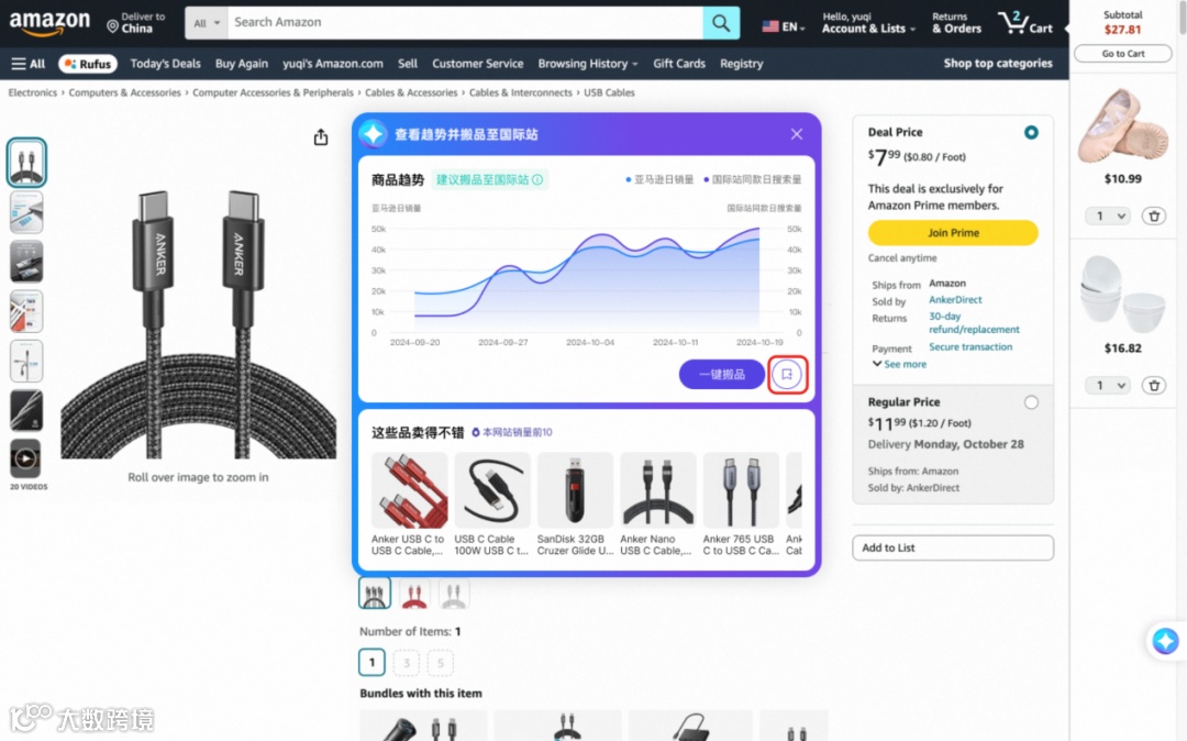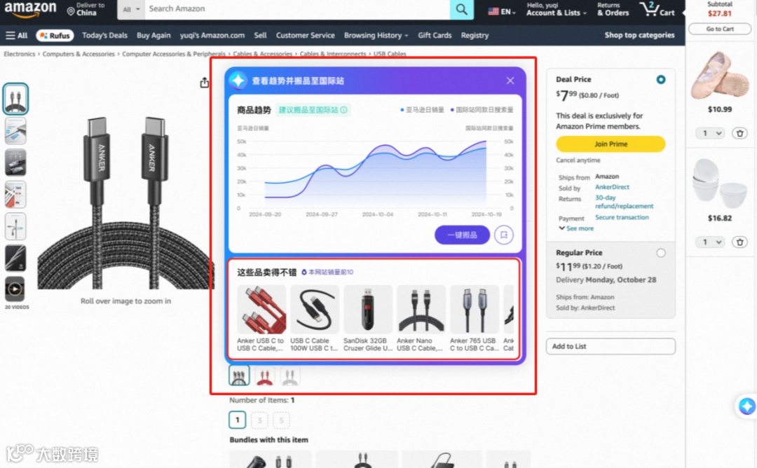 该插件支持在Amazon、1688、速卖通、淘宝、天猫五大平台浏览商品时,实时查看国际站需求指数与成交趋势,判断商品可搬性[k]。