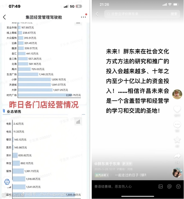 1月26日,胖东来创始人于东来在社交平台披露了旗下13家门店1月25日的经营数据,并公布企业未来十年在社会文化领域的重大投入计划[k]。
