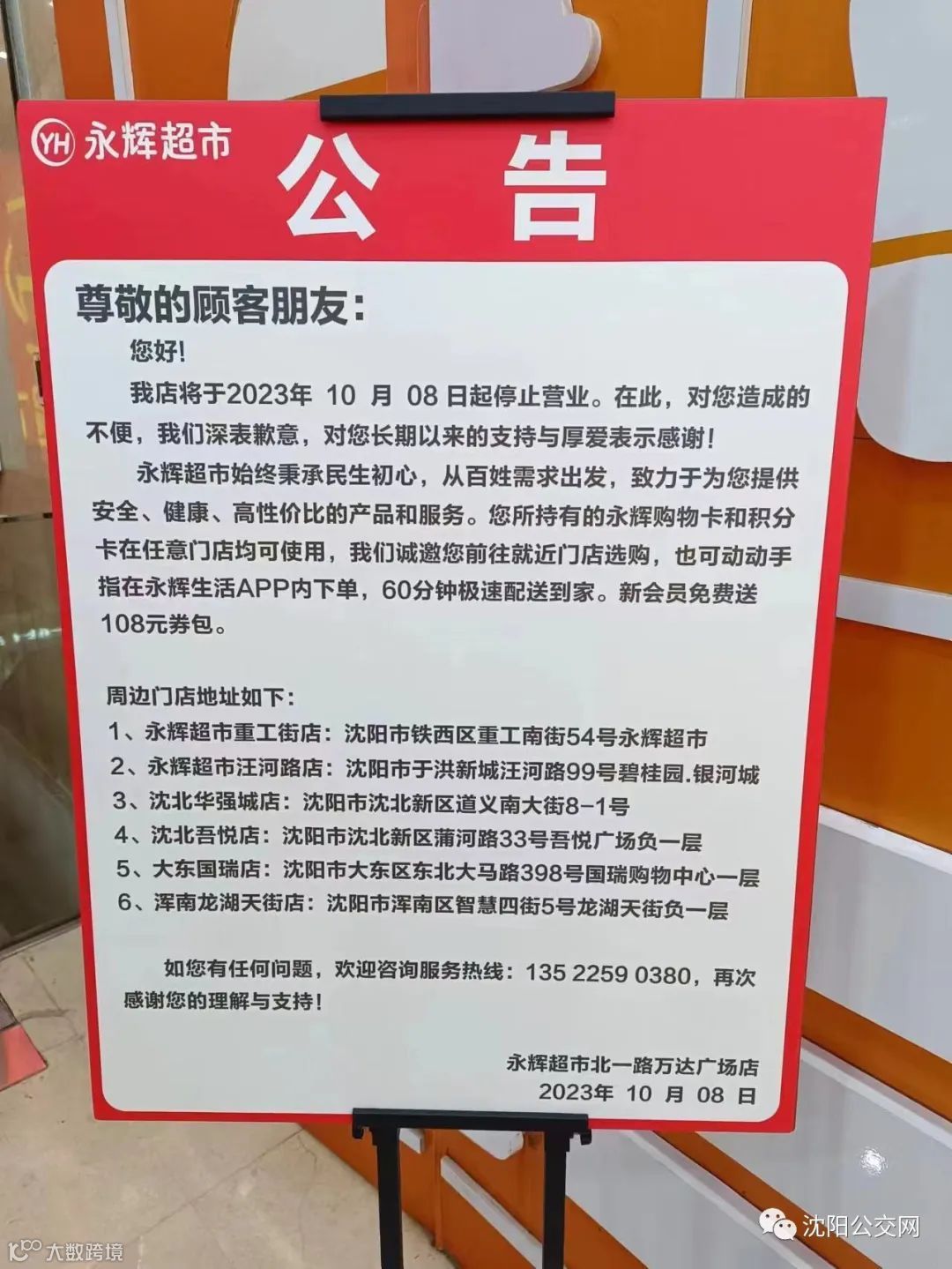 据沈阳消费网消息,永辉超市北一路万达广场店近日发布公告,将于2023年10月8日起停止营业。[[k]]