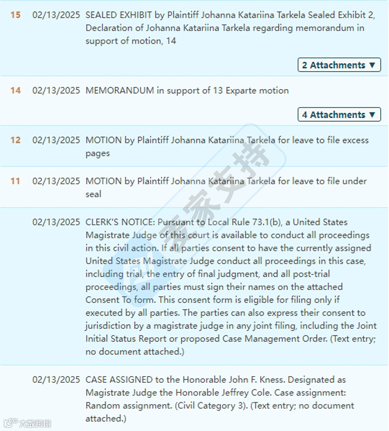 本案是芬兰的数字艺术家Johanna Katariina Tarkela委托keith律所发起的又一起维权,该品牌方上一次维权有高达168个涉案店铺被TRO冻结,案件号为24-cv-05822,该案已于24年8月底通过法院缺席判决,有超一半账户资金被划扣!时隔半年,该品牌方再次维权归来,跨境卖家切勿大意,仔细排查!
