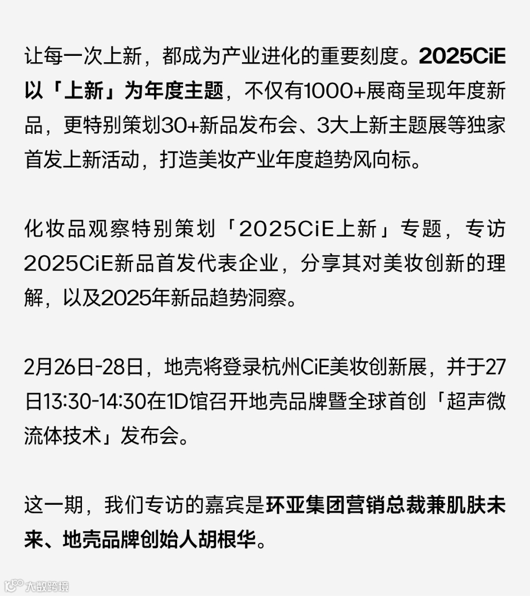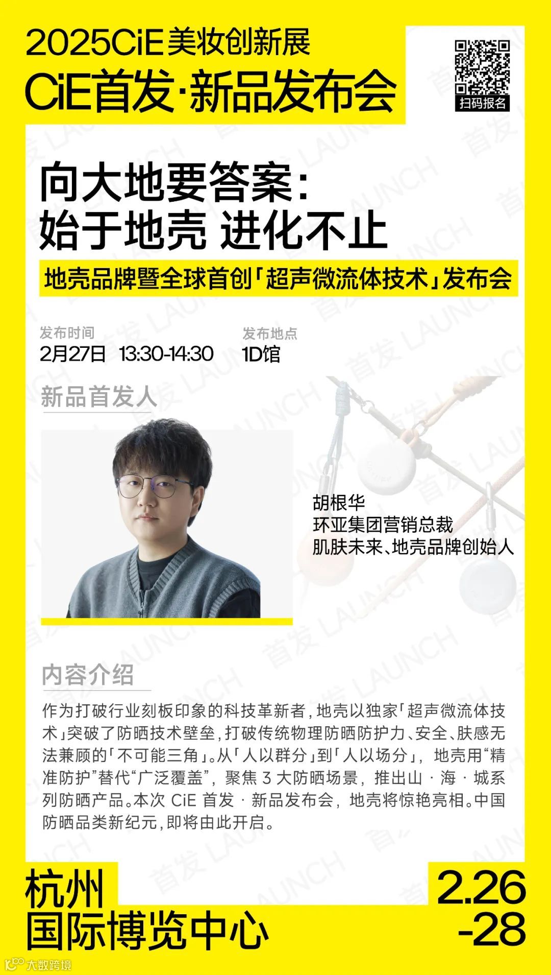 2月26日-28日,地壳将登录杭州CiE美妆创新展,并于27日13:30-14:30在1D馆召开地壳品牌暨全球首创「超声微流体技术」发布会。这一期,我们专访的嘉宾是环亚集团营销总裁兼肌肤未来、地壳品牌创始人胡根华。点击链接报名。