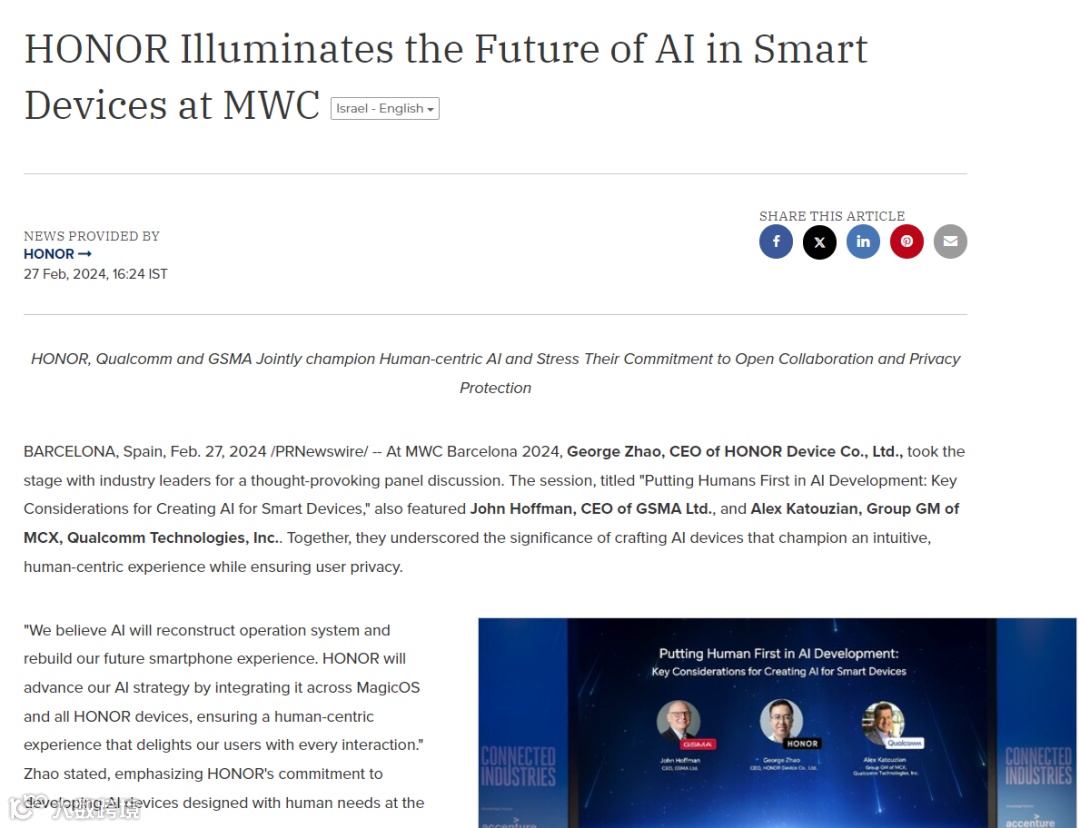 例如,3月MWC世界移动通信大会即将举办,参展商通过全球铺设消息稿件释放重磅产品信号,抢先拉升参展热度。2024年中国手机品牌荣耀便利用通稿宣布将于MWC展示其最新的AI战略。
