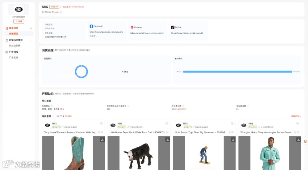 GoodsFox 店铺投放榜显示,DTC 独立站 NRS(National Roper's Supply)在最近7天的全球独立站广告投放中排名第一,全球独立站访问量排名为525,广告素材投放量超5000个,显示出其强大的广告投入和市场扩展能力。