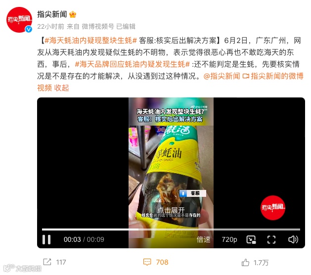 海天蚝油疑现“生蚝”?官方回应,真相待查