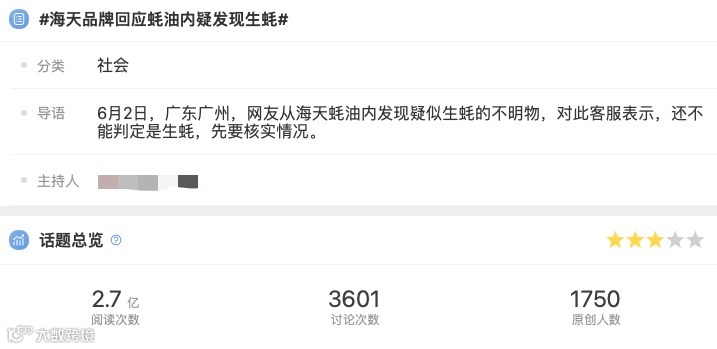 6月5日,#海天品牌回应蚝油内疑发现生蚝#话题登上微博热搜,累计阅读量达2.7亿次。据媒体报道,6月2日,广东广州一名网友反映,其购买的海天蚝油中发现疑似整块生蚝的不明物质,引发广泛关注[[k]]。