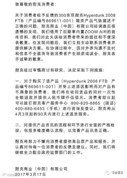 3月17日,耐克商业(中国)有限公司通过其官方微博发布声明,就消费者反馈的300余双Hyperdunk 2008FTB篮球鞋(央视3·15晚会曝光的“气垫门”产品)因宣传中气垫描述不实问题,向消费者公开致歉[1]。耐克表示,对于因此次问题对产品不满的消费者,公司将收回商品并一次性全额退款,同时提供人民币4500元[1]。