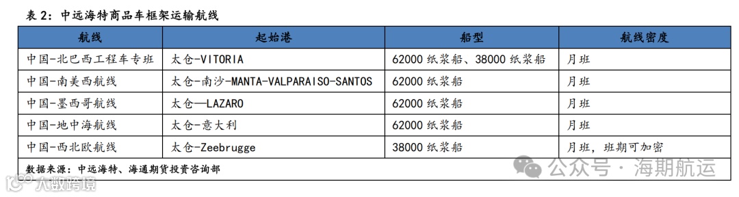 目前,中远海特已开通五条商品车框架运输航线,覆盖南美及欧洲多个港口,服务奇瑞、长安、江铃等主流车企,为我国汽车出口提供高效、稳定的海运支持[k]。