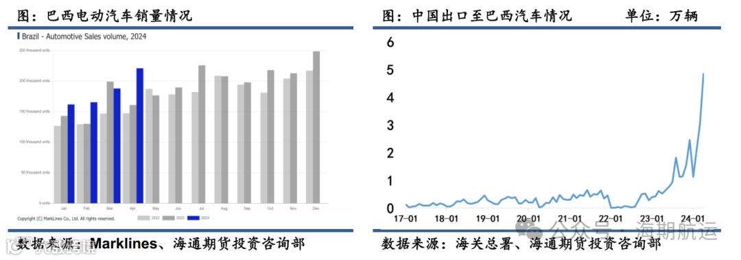 巴西原对进口汽车免税,2024年起分阶段对新能源车加征关税,至2026年7月最高达35%。该政策引发进口商抢运,推动中国对巴西汽车出口激增。2024年1-4月,出口量达历史高位,多家车企如比亚迪、长城已在巴西设厂[k]。