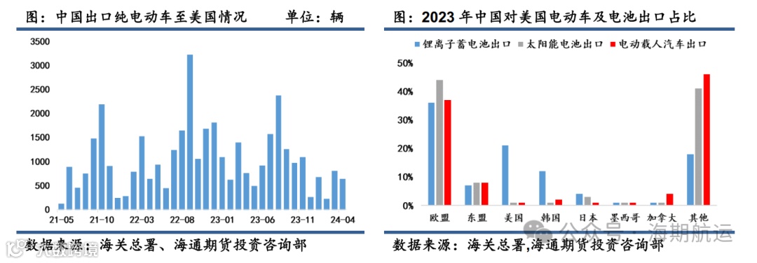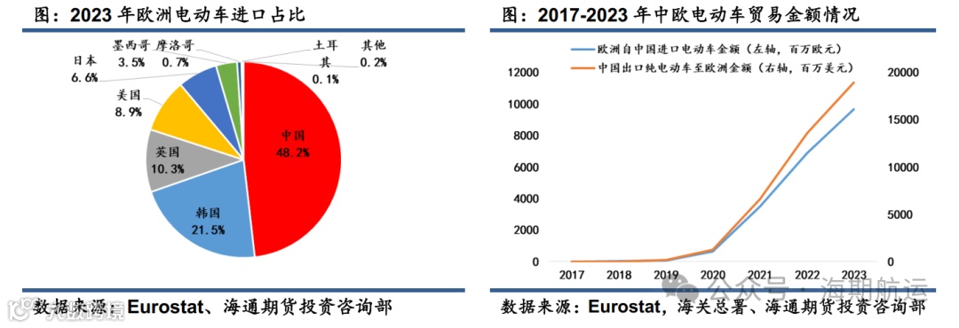 欧盟目前对中国电动车征收10%关税,2023年9月启动反补贴调查,可能加征15%-30%关税,但尚未落地。德国等国家反对加税,内部存在分歧。2023年欧洲进口中国电动车占比48%,较2022年下降。若加税落地,可能引发短期抢运,支撑航线运价,但长期取决于政策实际执行及中欧博弈[k]。