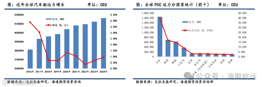 截至2024年5月,全球汽车船共782艘,总运力416.3万 CEU。日、韩、挪威、以色列、美国五国占全球运力80%以上,中国仅占约3%,排名第七[k]。