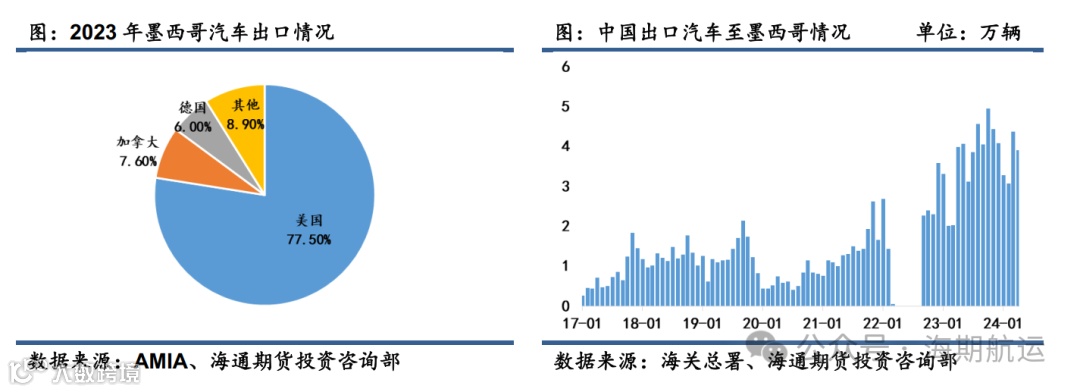 墨西哥原对中国新能源车提供优惠,2024年4月起对包括汽车及零部件在内的544项商品加征5%-50%临时关税。中国为墨西哥第二大汽车进口来源,2024年前4月出口14.5万辆,占其本土销量超30%。但因墨西哥约80%汽车出口至美国,受“美墨加协定”制约,其政策受美国影响显著,未来对中国汽车及零部件出口构成不确定性[k]。