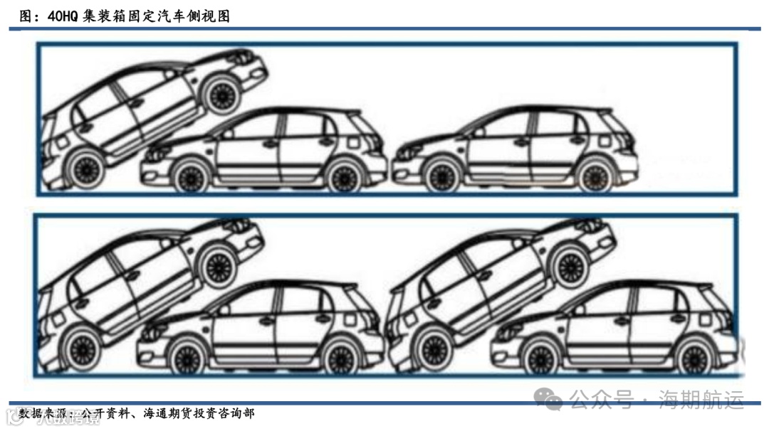 自2003年起,随着我国汽车出口持续增长,滚装船运力紧张促使企业转向集装箱运输,催生“整车装箱”模式[k]。该方式将1至4台汽车固定于40英尺集装箱内(多用高柜),通过普通货船运输,实现“以箱代库”,缓解经销商仓储压力[k]。相较于传统滚装运输,集装箱班次更密集、覆盖港口更广,且可结合铁路运输,灵活性更高[k]。同时,因多数港口具备集装箱装卸能力,车企可就近出港,大幅降低陆运成本[k]。