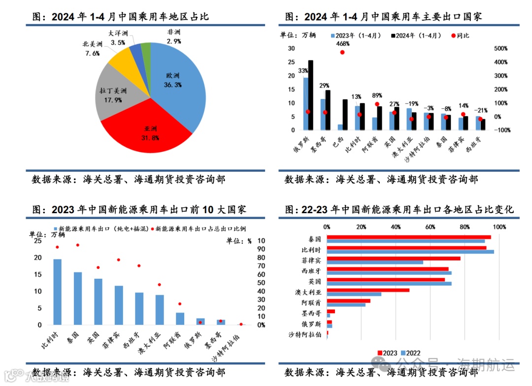 2023年中国汽车海运出口近400万辆,占全球近13%。按区域划分,2024年1-4月,欧洲为中国最大出口区域(占比36%),其次为亚洲(32%)、拉美(18%)[k]。