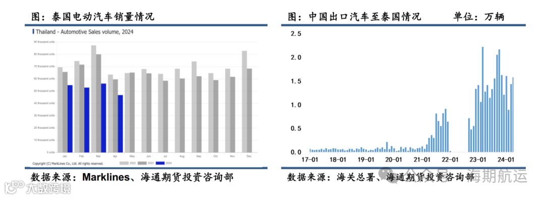 泰国自2018年起对汽车进口实施零关税,积极发展新能源汽车产业,吸引比亚迪等中国车企建厂。2024年前4月,中国对泰出口5.4万辆,同比下降8%,但泰国仍为中国在东南亚最大出口市场。印尼、马来西亚等也将成为新能源车出口增量重点区域[k]。