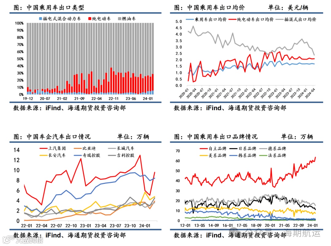 中国乘用车出口仍以燃油车为主,但新能源车增长迅猛。2019年至2023年,新能源乘用车(含纯电、插混)出口量从3.1万辆增至118万辆,复合增速达110%,远高于燃油车33%的增速。新能源车占乘用车出口总量比重由不足10%升至约30%。纯电动车型均价从2020年近1万美元/辆提升至当前近2万美元/辆,仍低于日本(约3万美元/辆),具备价格优势[k]。
