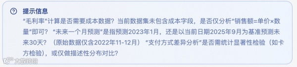 打破分析能力边界: 用户无需预先知道该用描述性统计还是构建预测模型。Data Agent 能根据用户模糊或复杂的自然语言提问(比如“为什么上季度华东区销售额下滑?预测下季度趋势并给出改善建议”),自动判断所需的分析技术组合,无缝衔接查询、诊断、预测和规划。
