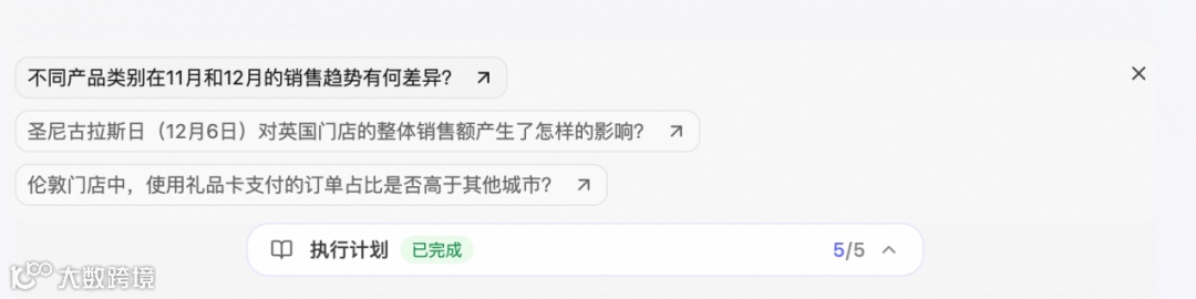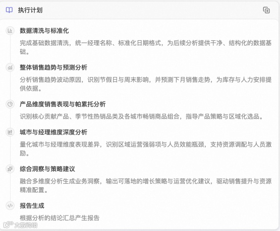 在语义结构明确后,Data Agent 会自动生成意图执行计划,以结构化方式给用户展示分析思路,用户也可以根据需要进行调整。