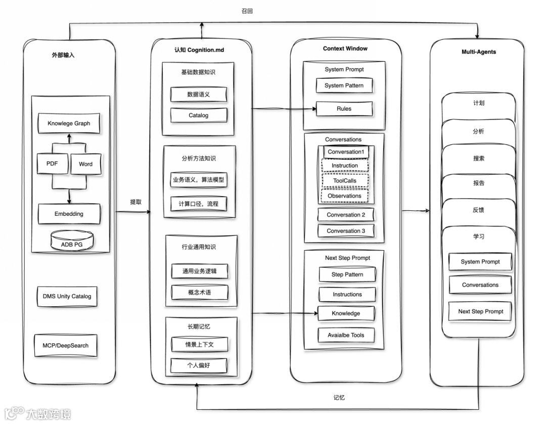我们称为Cognition,有点拟人化意思。 包含前文描述的三层知识(基础数据知识,分析方法支持和行业通用知识),同时包含Agent的长期记忆, 作为 Data Agent的认知基座,为每次分析提供认知支撑。