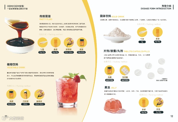 提供固体饮料、植物饮品、蜂蜜制品、传统膏滋、片剂、果冻酵素等多种剂型,覆盖益生菌、胶原蛋白饮、燃脂咖啡、睡眠饮、新中式零食、酵素等品类。