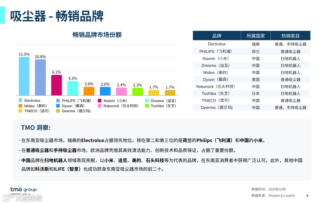 在扫地机器人市场,中国品牌凭借其高效、智能的特点赢得了大量消费者支持。小米、追觅、石头科技、美的、科沃斯等品牌均在Shopee和Lazada上取得了显著的销售成绩,成为市场的重要竞争者。