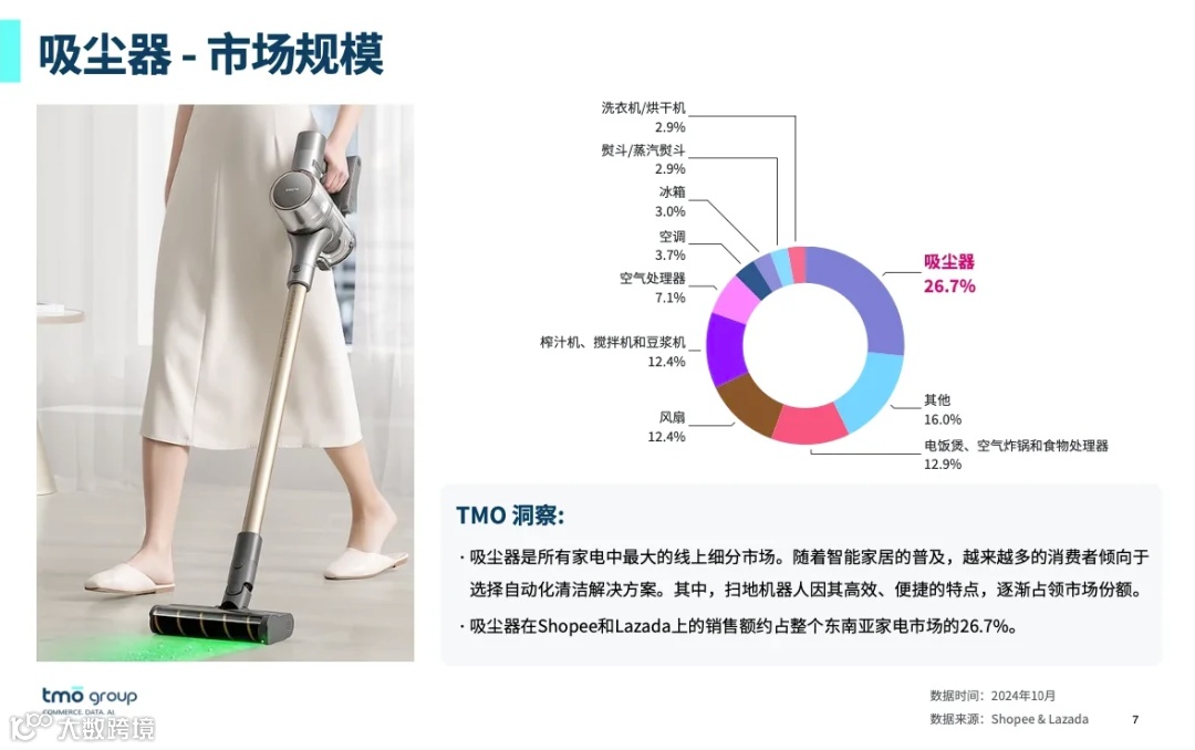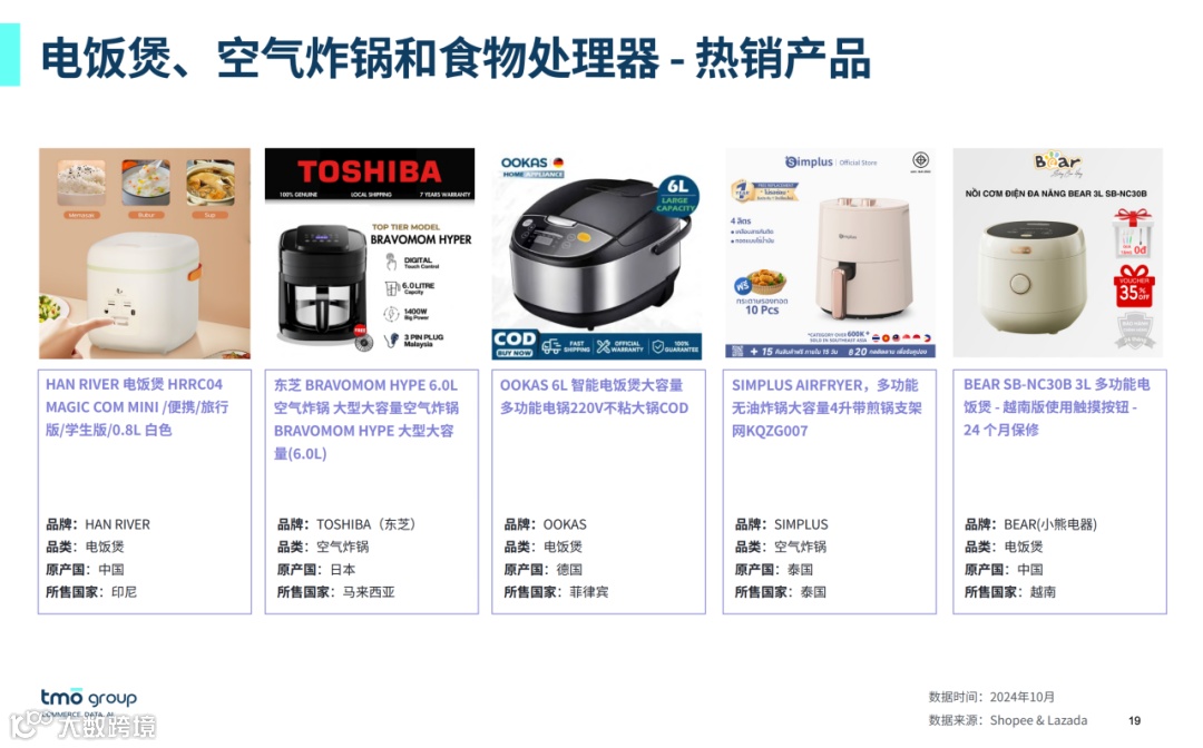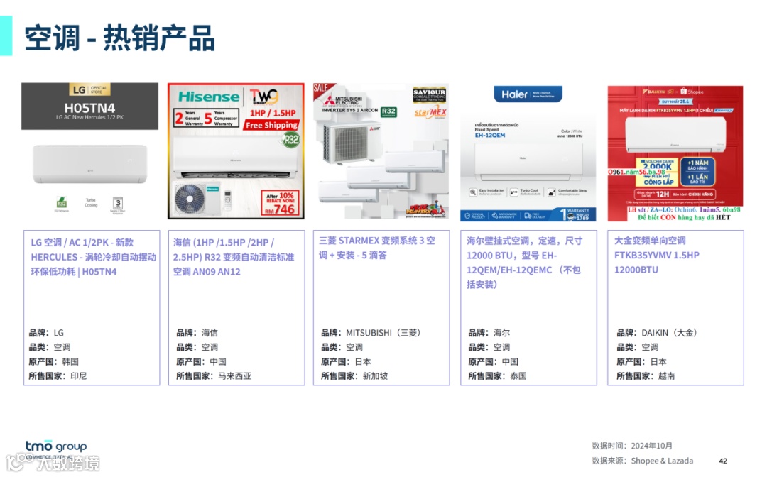 TMO在2024年上线的全新免费报告《东南亚家用电器行业市场洞察》。报告分析内容基于TMO 数据分析团队于 2024年10月从两个最著名的东南亚电商平台Shopee 和 Lazada收集的38万SKU信息,报告选取两大平台家电中销售靠前的九大细分品类: 吸尘器;电饭煲、空气炸锅和食物处理器;风扇;榨汁机、搅拌机和豆浆机;空气处理器;空调;冰箱;熨斗/蒸汽熨斗;洗衣机/烘干机。
