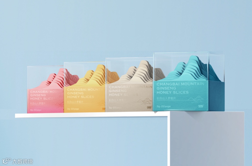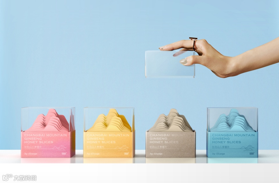 长白山人参蜜片包装设计以长白山主峰为原型,将独立小包装堆叠成山峰造型,外覆透明塑料盒,突显产品天然纯粹的原料属性。每片包装采用激光雕刻工艺,形似岩石肌理,整体视觉错落有致,宛如一件陈列的艺术品[k]。