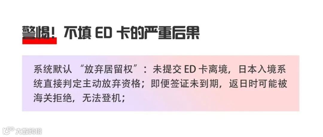 未提交ED卡离境,日本入境系统会直接判定主动放弃居留资格,即便签证未到期,返日时也可能被海关拒绝、无法登机。
