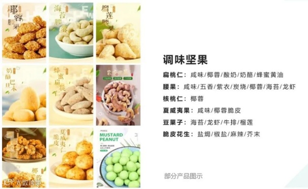 • 调味坚果:每日坚果、混合坚果、龙虾/海苔/榴莲味坚果、椰蓉腰果/核桃/夏威夷果等;