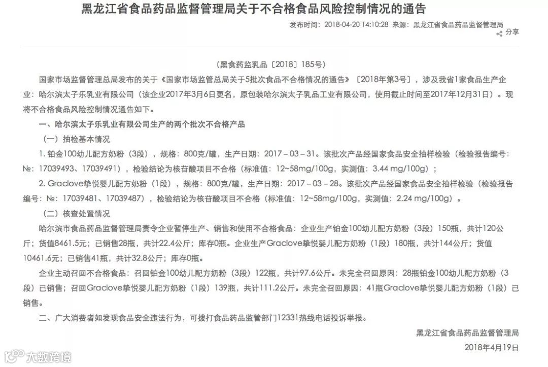 黑龙江省食品药品监督管理局近日通报了哈尔滨太子乐乳业有限公司不合格奶粉的风险控制情况,确认该公司已对问题产品实施主动召回[k]。