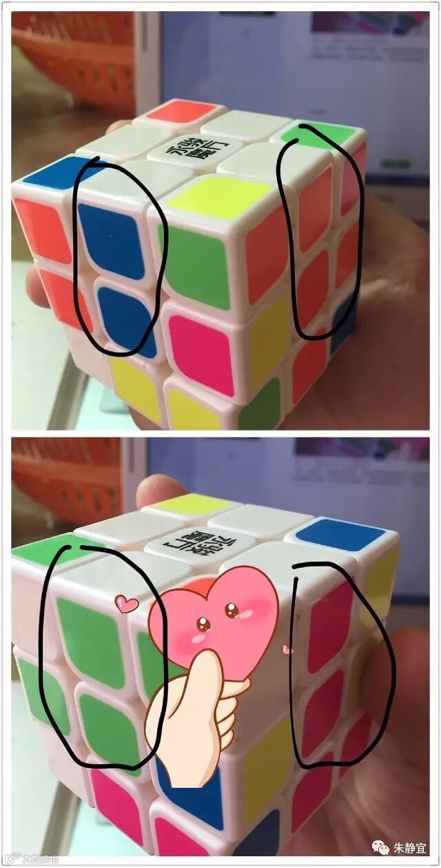 3.相邻角块相同,对的放在左边。右手公式三遍,左旋转90度,在做三遍左手公式。