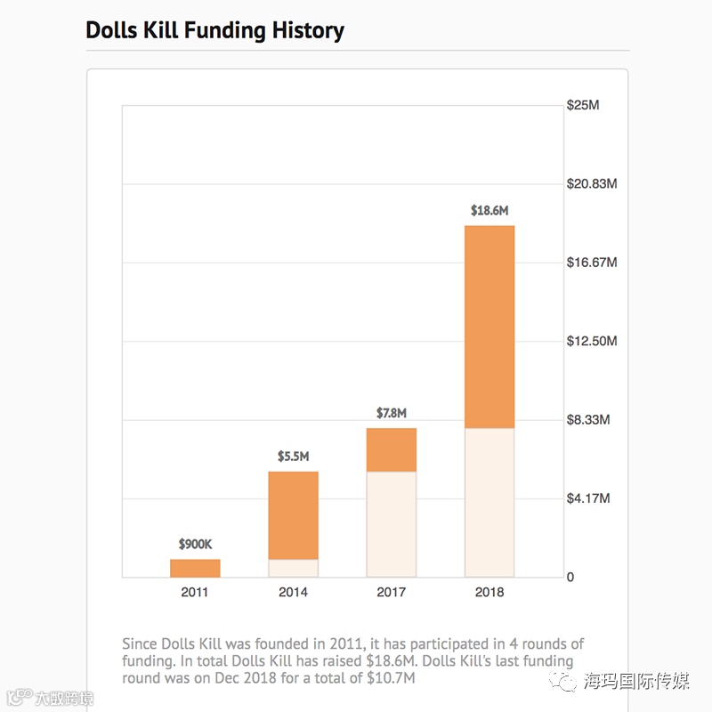 2018年,Dolls Kill迎来了改变品牌命运的“千禧风”“Y2K”全球时尚热潮,并借助当时在欧美爆火的TikTok社交软件,一举成为受到Z世代热捧的网红潮牌,销量和知名度都几近翻倍;同年,Dolls Kill从以消费者为中心的风险投资公司 Maveron领投的1500万美元天使轮融资。