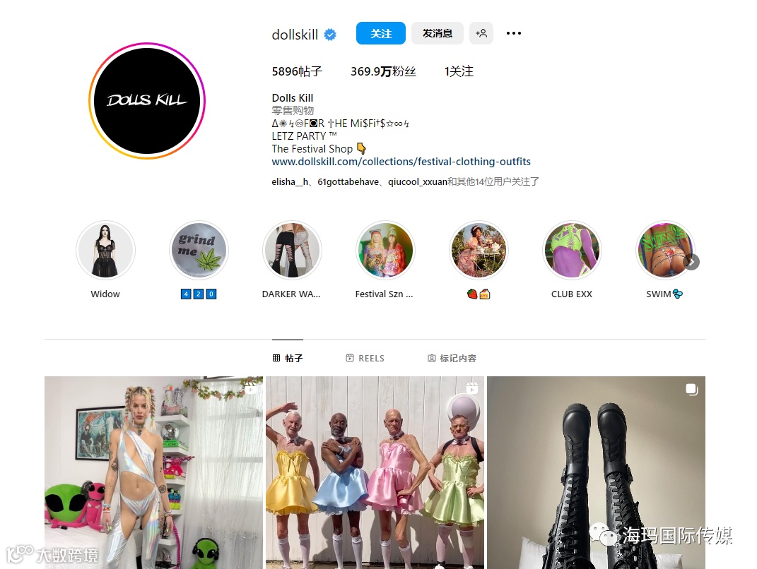 作为Z世代的网红品牌,Dolls Kill在Instagram和TikTok上都拥有大量的粉丝,其Instagram粉丝数量达到370万,而TikTok粉丝数量则达到160万。而作为Z世代的两大主流社媒,Instagram和TikTok用户在风格和习惯上却有着不同的行为习惯。