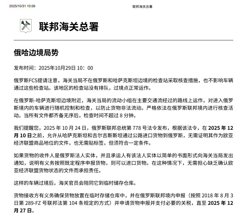 导读:俄罗斯联邦海关总署于10月29日发布最新公告,针对当前俄哈边境的通关情况作出明确说明。