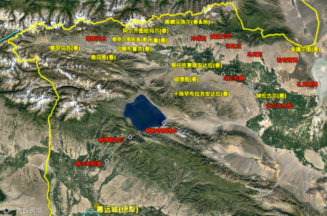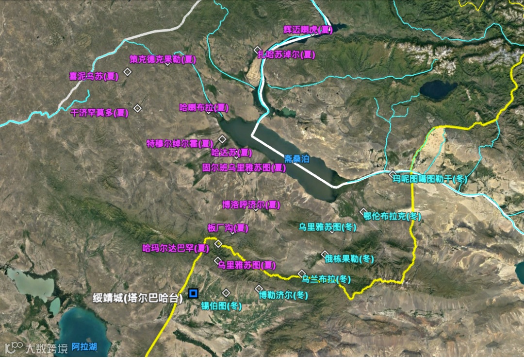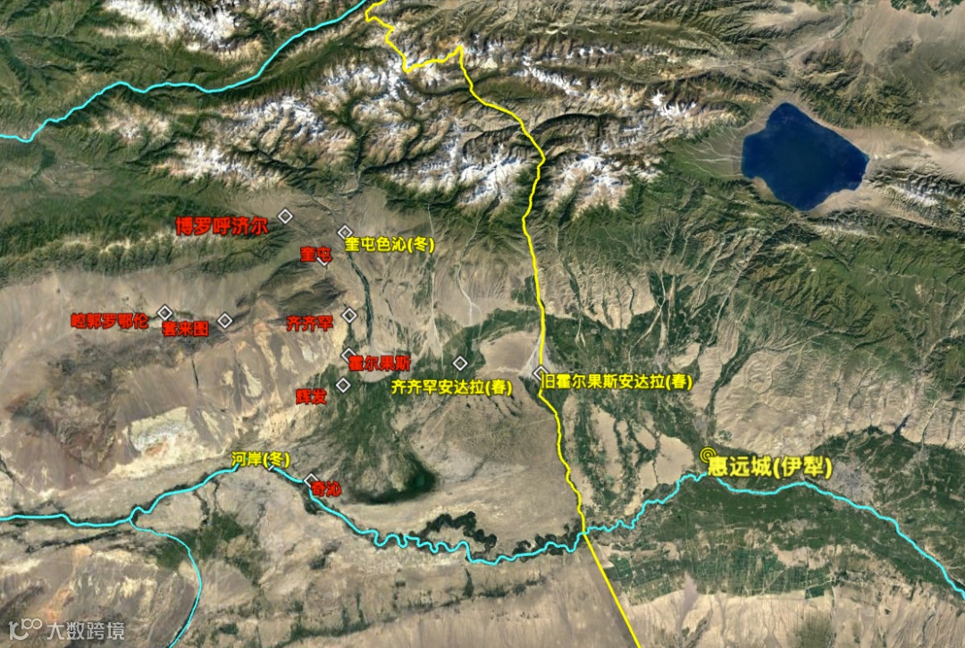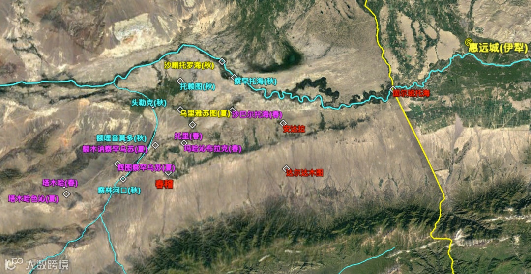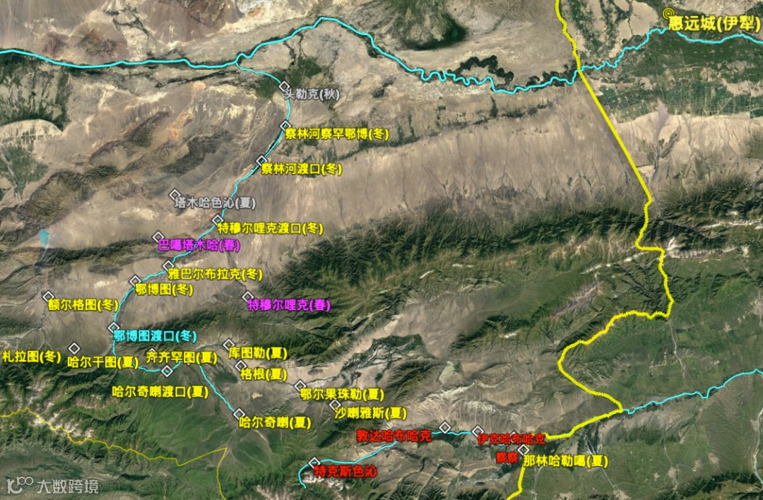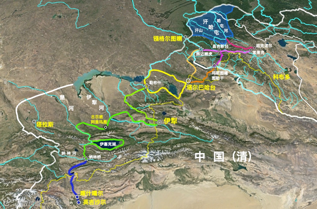 (参考《新疆察哈尔蒙古西迁简史》,宝音朝克图《清代北部边疆卡伦研究》和谭其骧《中国历史地图集》)
