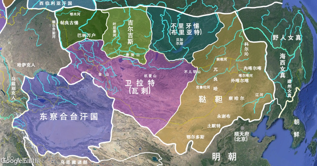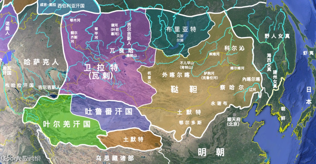 1388年,孛儿只斤·也速迭儿(Yisudar)弑君称汗,尊号“卓里克图汗”,位于蒙古高原西部的卫拉特部(Oirat)开始与蒙古本部分裂,1402年后明朝称蒙古本部为“鞑靼”,称卫拉特为“瓦剌”。